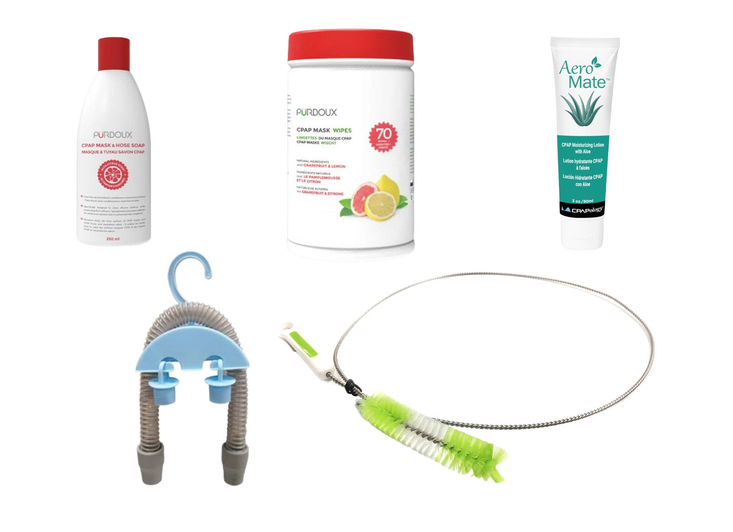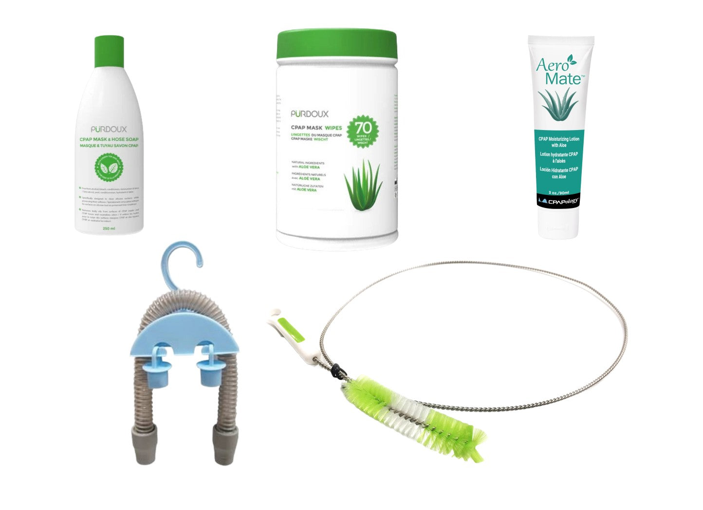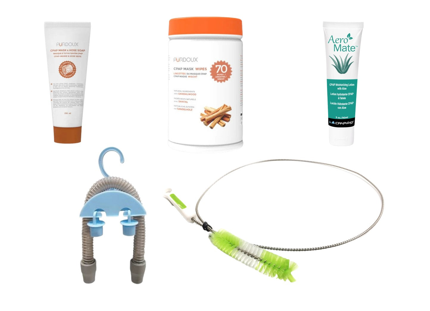 Your all in one bundle to keep your CPAP device and its accessories clean and ready for therapy! This variety pack includes a Canister of 70 CPAP Mask wipes, a Bottle of CPAP Mask and Hose Soap, a Hose Brush, a CPAP Tube Hanger, and a Face Lotion designed to sooth your skin if you experience irritation from CPAP Mask.